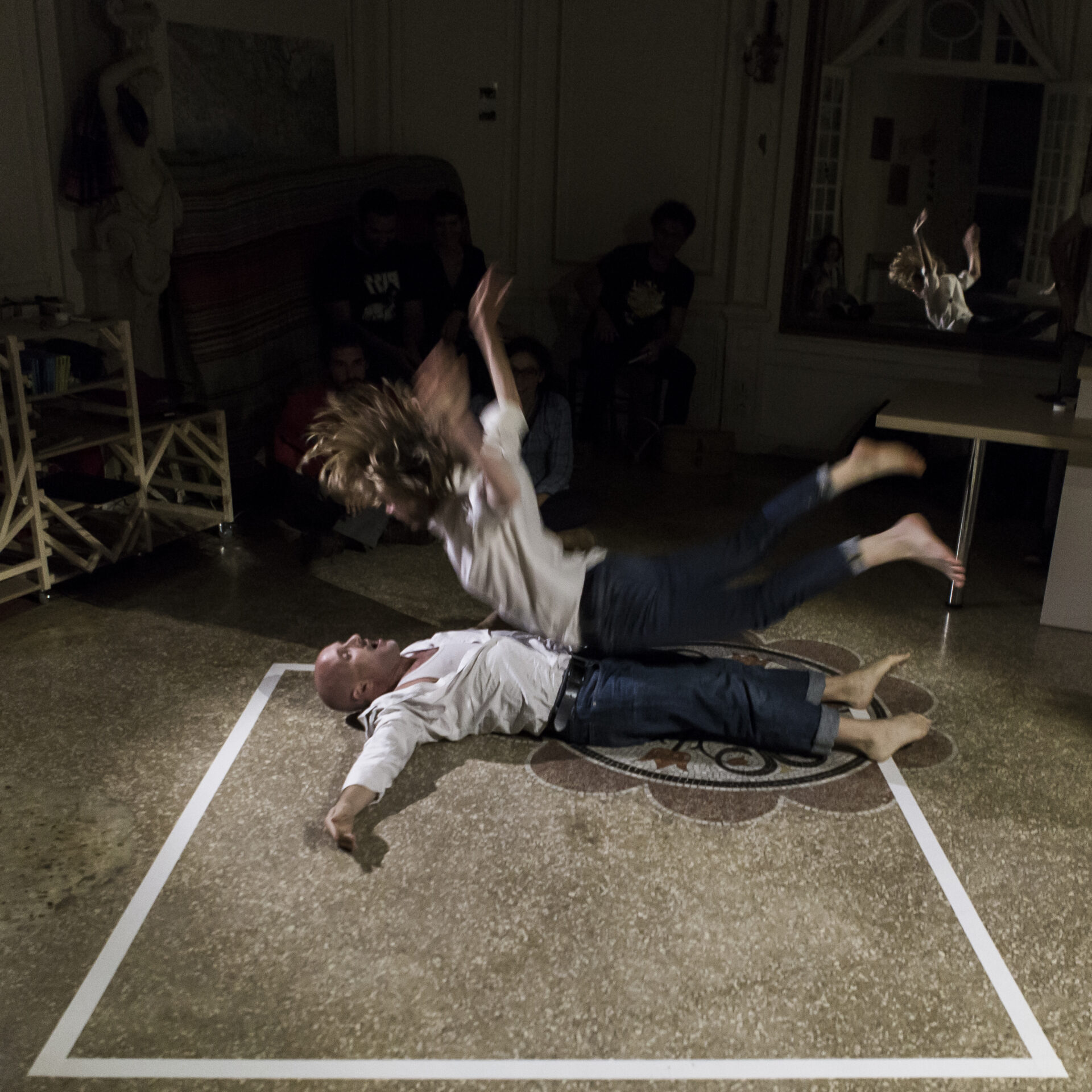 duO2 est un travail sur l’air, sur cette relation la plus archaïque et vital à nous mêmes : la respiratoire. L’air passe et outrepasse, à deux on l’on le lésine, on le diminue jusqu’à l’apnée. Le mouvement semblerai être assujetti à ce souffle et le souffle amarré au corps. Des corps euphoriques parce hyper ventilés, des corps surmenés dans l ‘essoufflement, des corps enfin désenfles, affaiblis, fragiles comme des soupirs, duO2 est un récapitulation musclé où l’air aide à relier le corps et la danse.